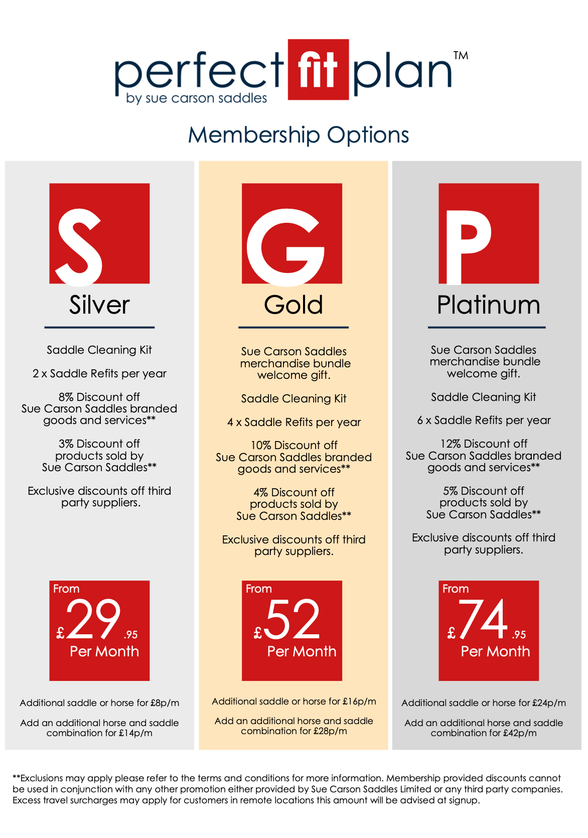 - Exclusive discounts on Sue Carson Saddles products and services and third party suppliers such as Eric Le Tixerant, Woof Wear, LeMieux and Catago.